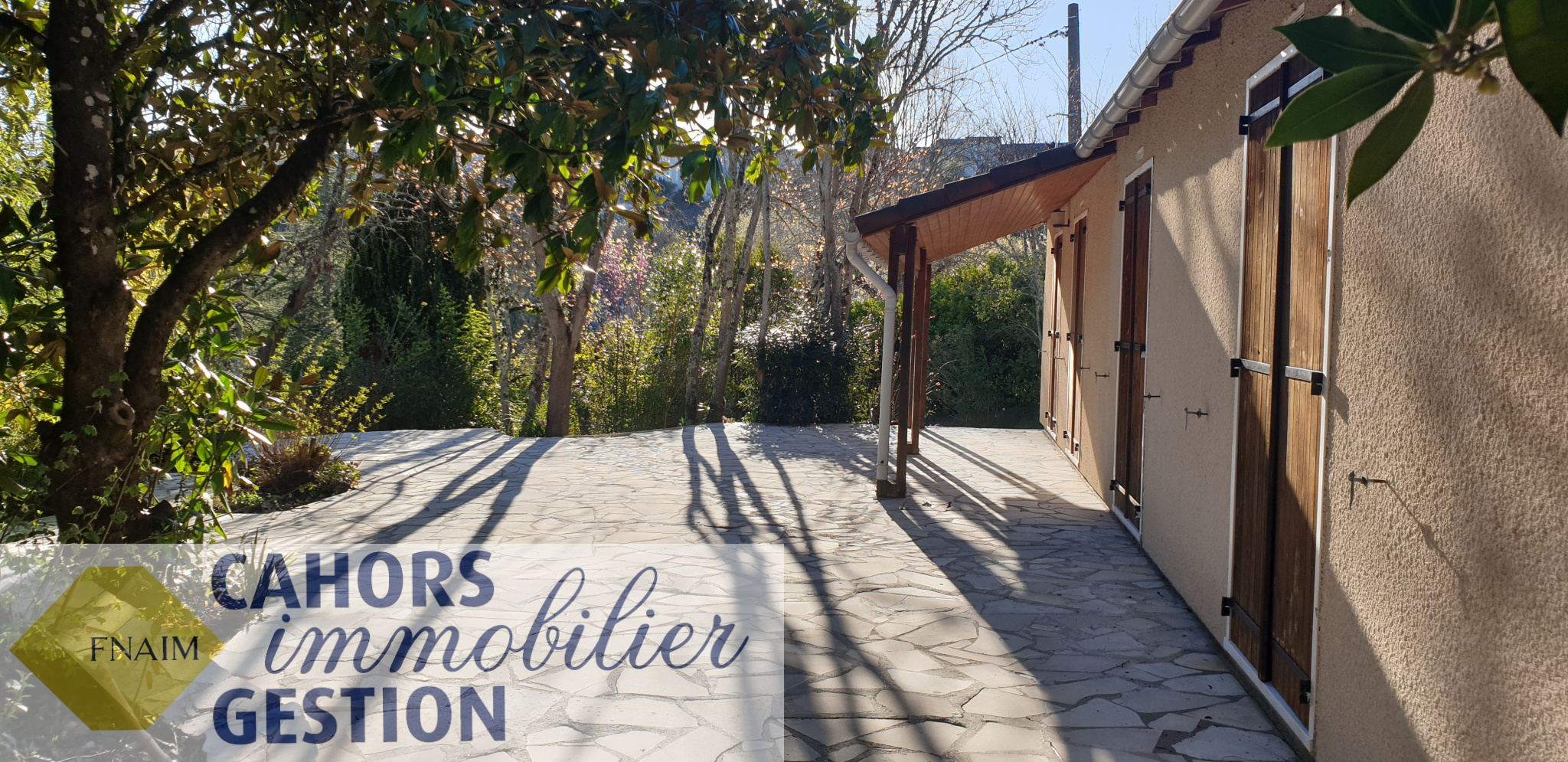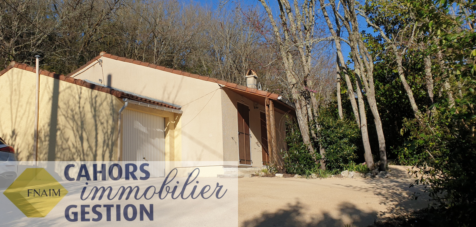 Maison plain-pied avec terrasse, garage et jardin.