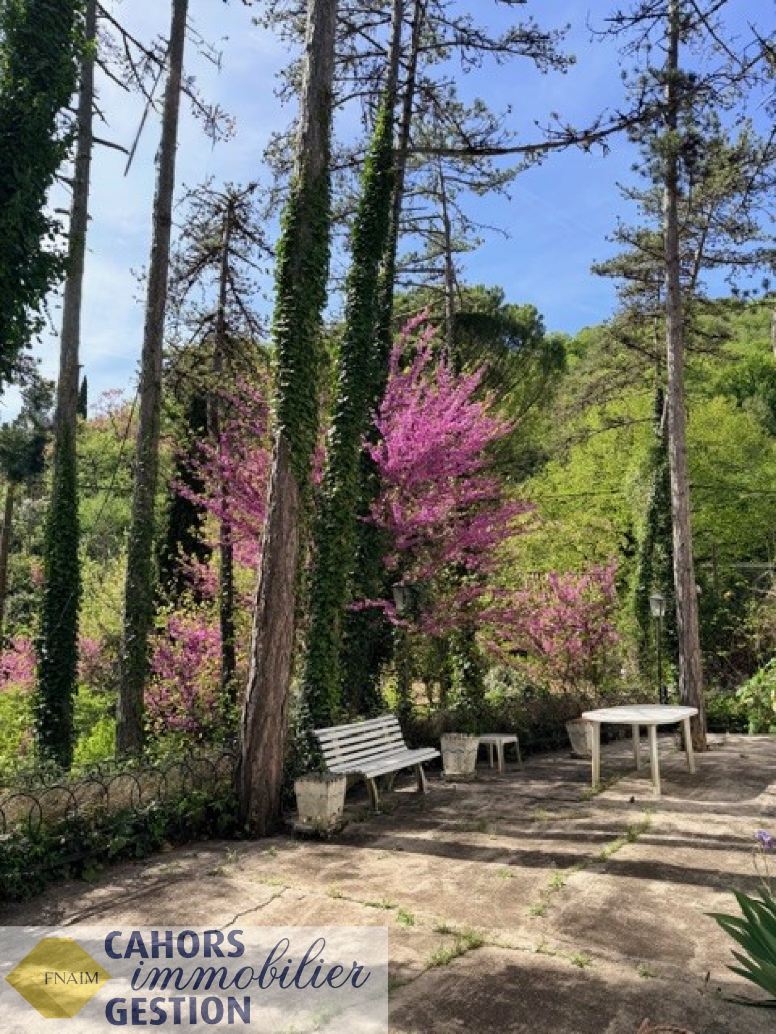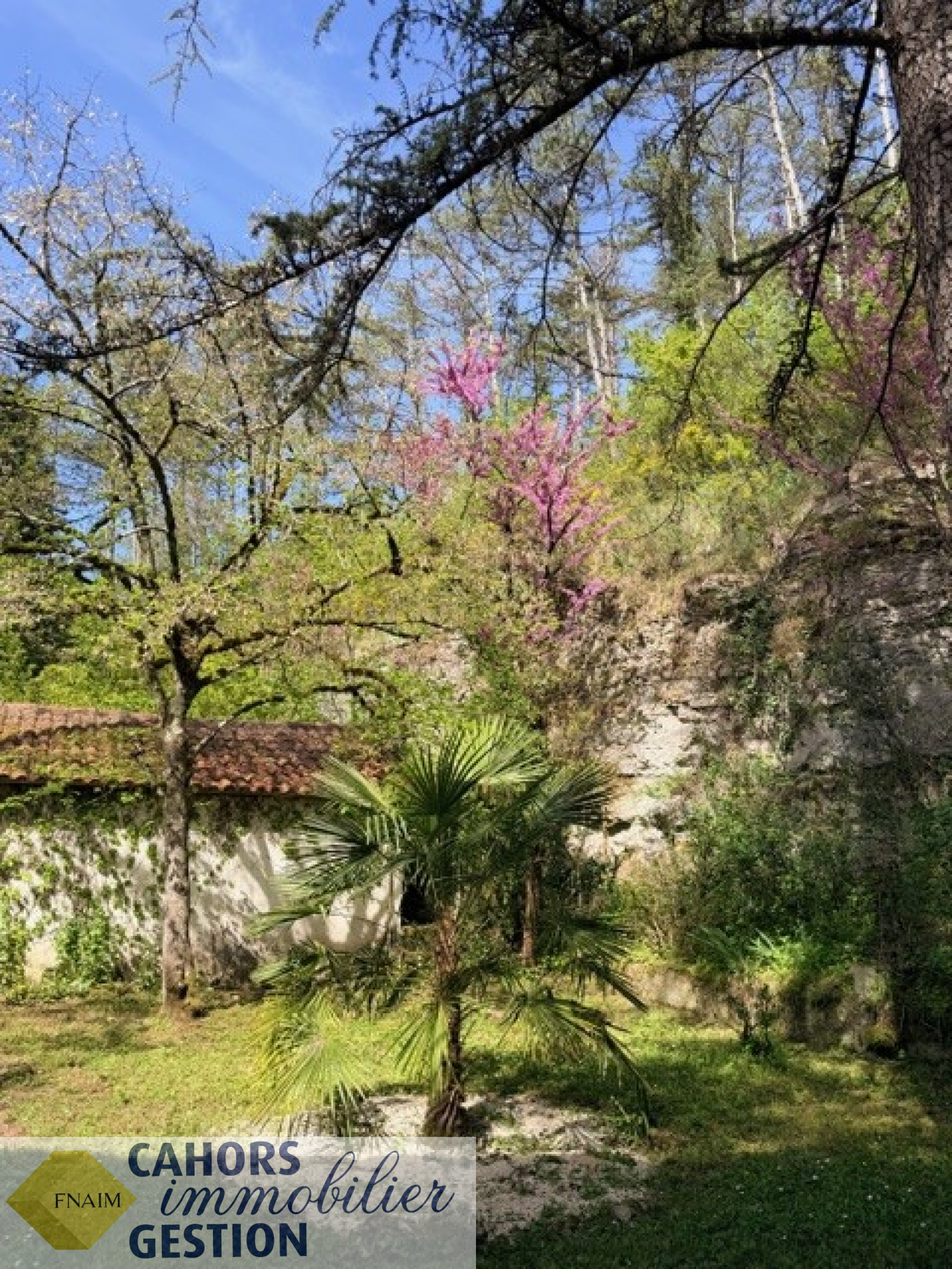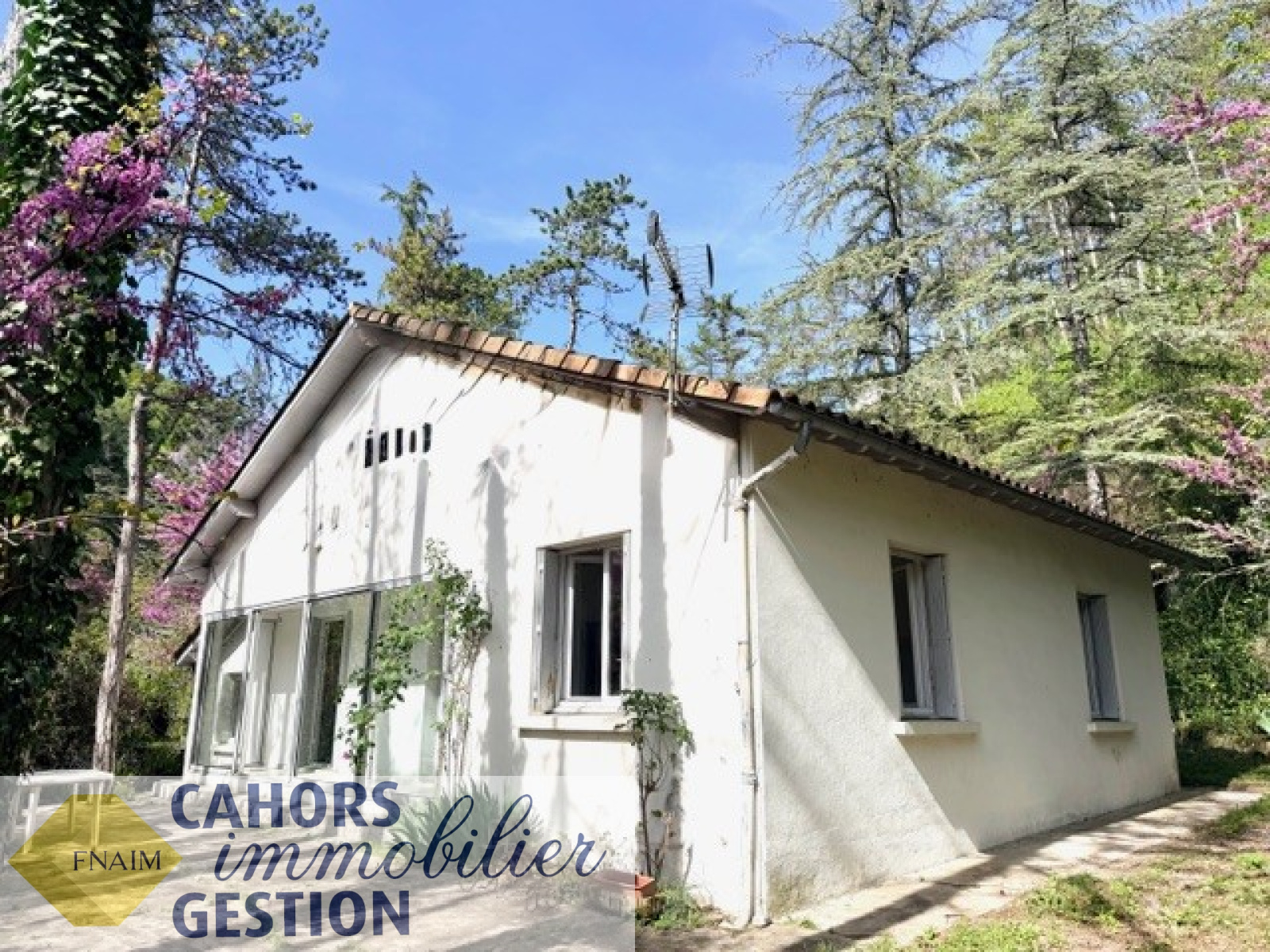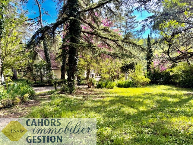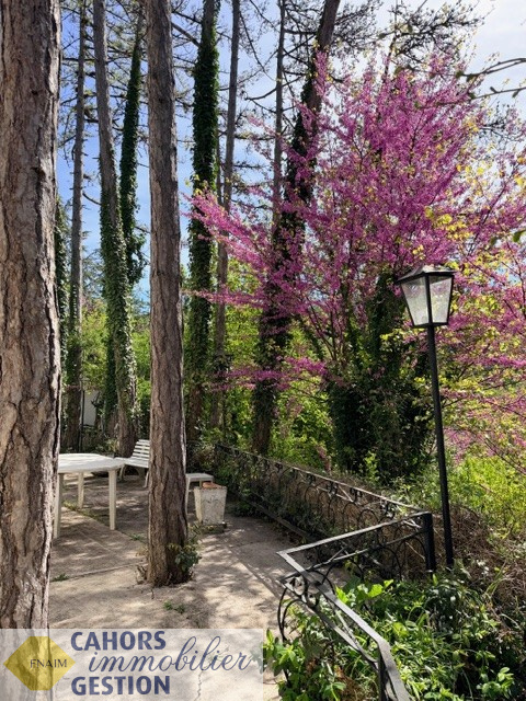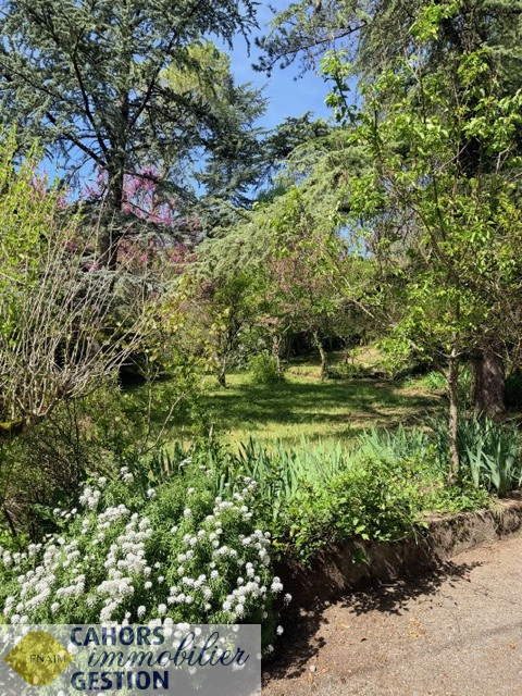 Dans environnement idyllique, Maison de plain pied luminueuse au calme avec jardin arboré comprenant entrée, cuisine, séjour avec loggia donant sur terrasse sans vis à vis, trois chambres, salle d'eau, garage et dépendance.